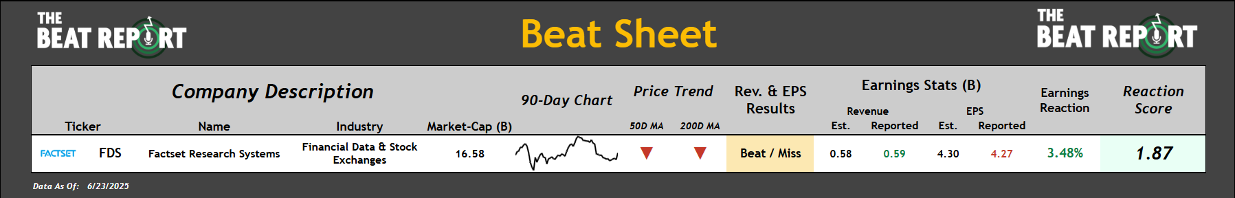 FactSet Research Systems had a +1.87 reaction score after reporting mixed results.