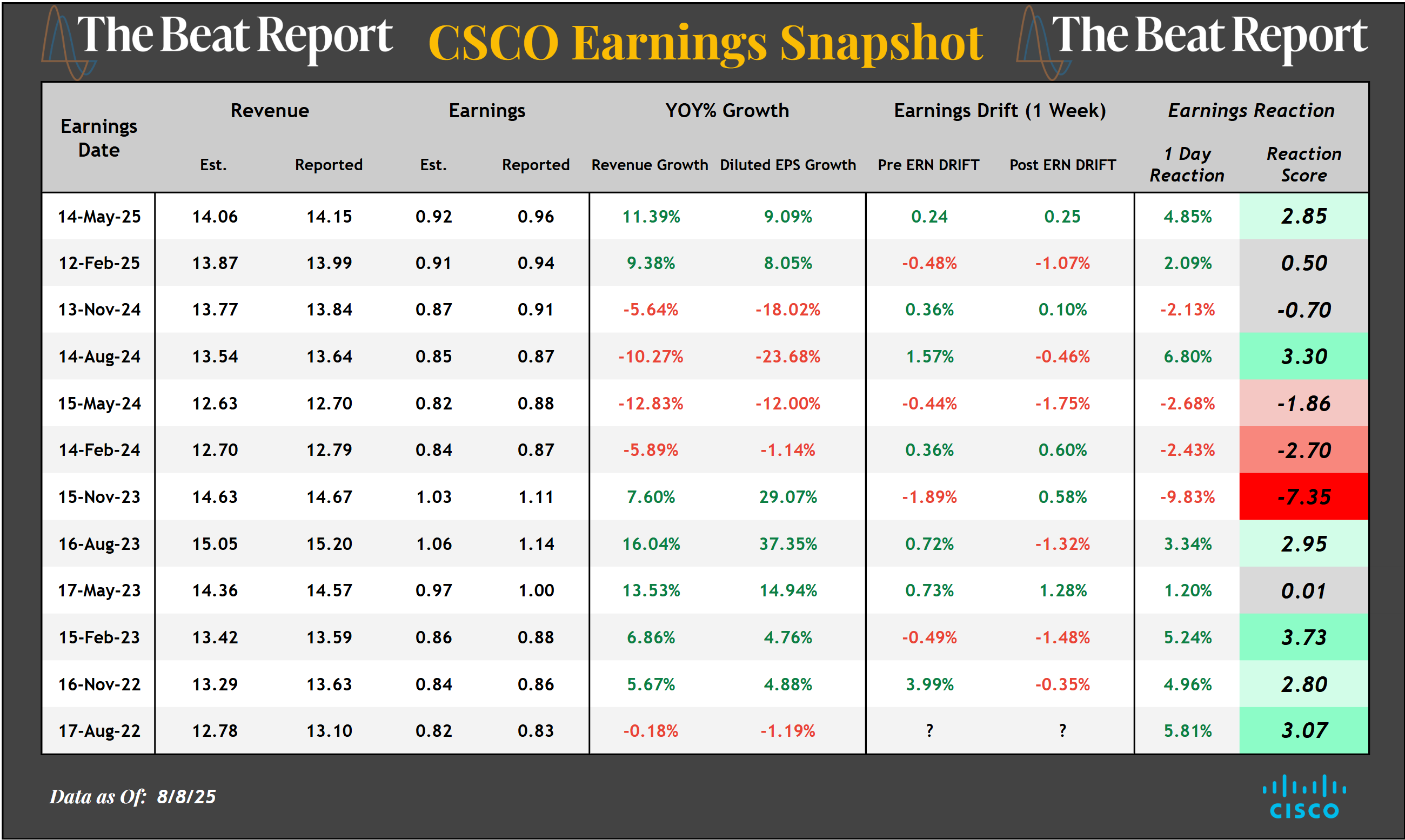 Cisco reports Wednesday after the close, with consensus calling for $14.62B in revenue and $0.98 EPS.