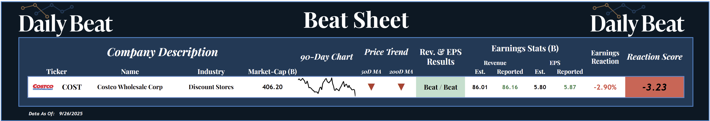 Following last Thursday's closing, the $406B discount store giant, Costco Wholesale $COST, beat its headline expectations and suffered a -3.23 reaction score on Friday.