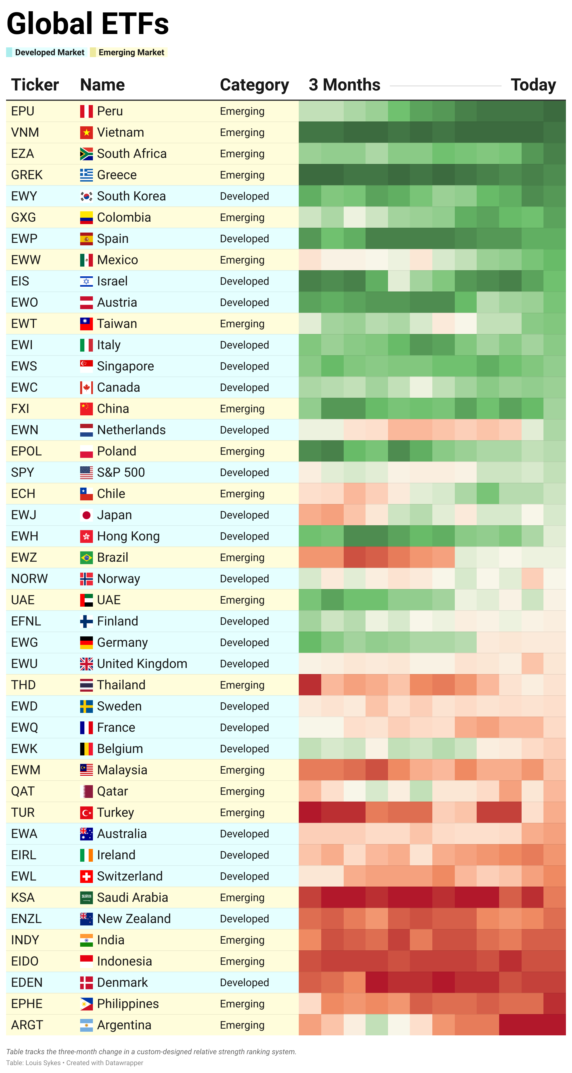 This week, the Netherlands $EWN really stands out. On our table, itโs made a successful transition from red to green, and the ETF just broke above its 2021 highs.