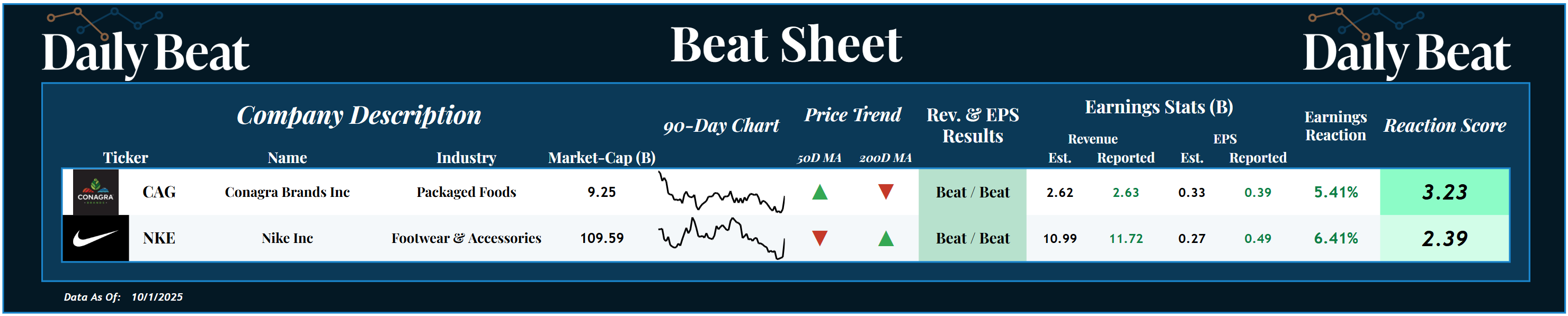 Wednesday, we heard from the $9B packaged foods company, Conagra Brands $CAG, which beat its headline expectations and had a +3.23 reaction score.