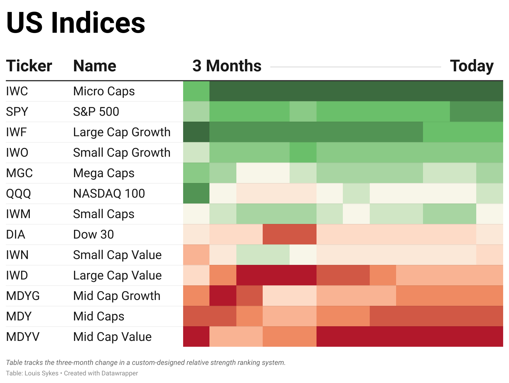 The fact that Micro Caps $IWC are at the top of the U.S. index table is a great sign that breadth is strong underneath the surface and there's demand for riskier, more speculative names.