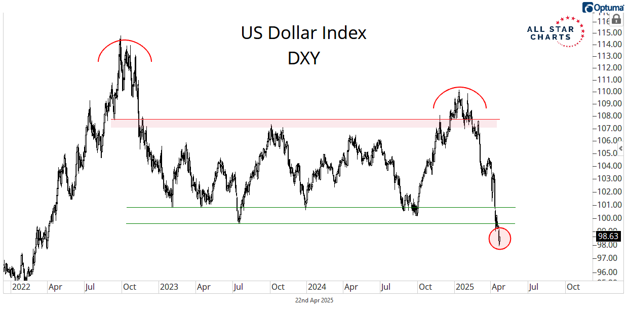 All Star Charts Premium When King Dollar Falls, the World Rotates By Jason Perz April 22, 2025 We’ve been talking about this regime shift for months — the slow rotation out of dollar strength and into international stocks.Today, the chart stopped whispering and started shouting.The U.S. Dollar Index $DXY just broke a level it held for nearly two years. That floor caught every correction since 2023. Until now. This isn’t just technical analysis. It’s storytelling in price form. King Dollar isn’t king anymore. Money is moving. Out of safe havens. Into metals, emerging markets, and global equities.The world isn’t betting on U.S. dominance. It’s betting on rotation. On sticky inflation. On global demand that doesn’t need permission from the Fed.We’ve positioned for this:International markets over U.S. large cap.Metals over cash.Real assets over narratives.Regime change doesn’t ring a bell. It doesn’t care about your timing.It just grinds forward — slowly, then all at once.This breakdown in the dollar? It’s not the start of something new.It’s the confirmation of what’s already begun.Stay with strength. Stay with the rotation.Click here for our Weekly Currency Report. More from All Star Charts Premium Steve Strazza Under The Hood October 27, 2025 Steve Strazza Top Down Trade of the Week (10/25/2025) October 25, 2025 Saturday Morning Chartoons: Decision Week October 24, 2025