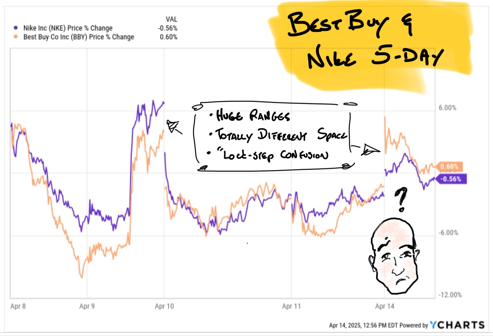 The fact that these are three very different companies facing the same specific catalyst is the point. It remains the case that a reckless trade war risks tipping us into a deep recession, fear of which what keeps people from buying "good news" on stocks like BBY, DKS and NKE. Nike and Best Buy shouldn't trade in perfect lockstep. The fact they are tells you as far as the market is concerned there's one issue facing the market and it's not getting fixed. I can wait.