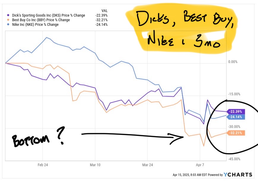 Best Buy, Dicks and Nike are all down over 20% in the last 2 months. They are companies of varying quality in terms of execution but Supply Chain positioning but they dominate consumer segments which have been beaten like Government Mules over the ever-changing battle with China and tariffs in general: