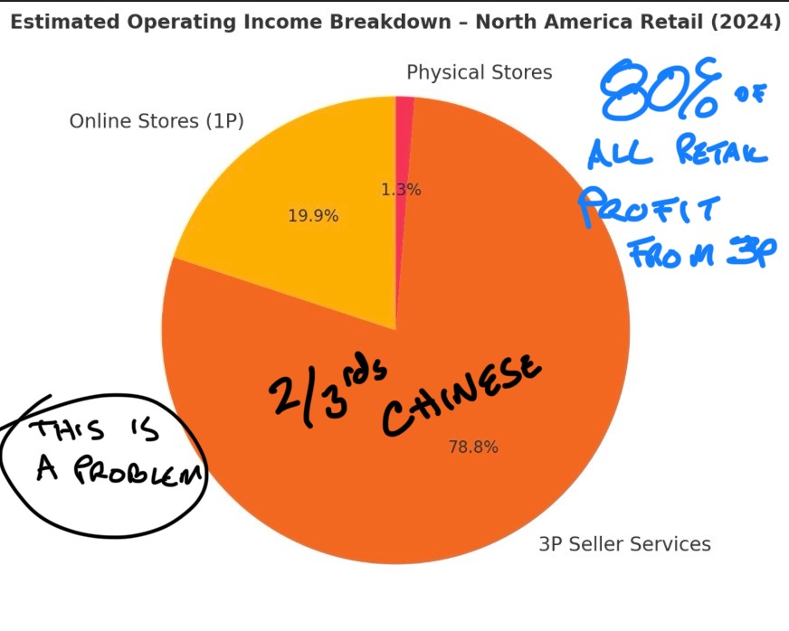 As much as 70% of all products sold by Amazon are produced in China. More concerning 80% of all Amazon's profits from retail operations come from 3P (third party) vendors, 2/3rds of which are based in China. Amazon rakes in over 60% gross margins on 3P sales (conservatively), triple its take from other online sales and more than 10x what Amazon makes on physical stores.