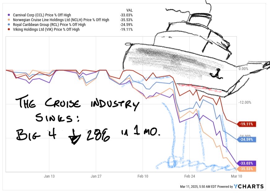 Carnival has mountains of debt and a lower-end target customer. They are the Walmart of cruising if Walmart had $1.50 in debt for every dollar of revenue and stores were lawless pirate ships. Last quarter Carnival said advanced bookings were at an all-time high. Of course, that was December when the market was also at all-time highs and Trade Wars were still sort of a quirky idea that wouldn't last.
