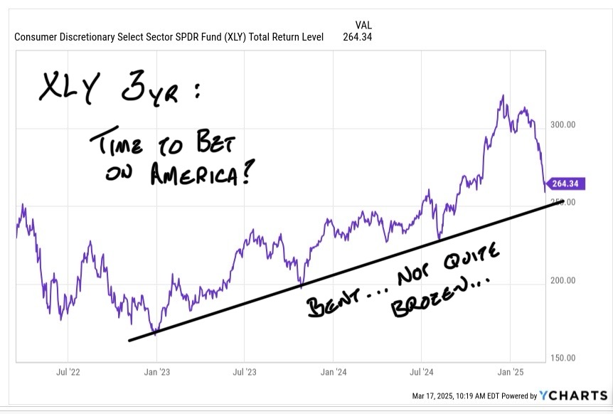 Being the low-price provider of discount grocery and household items isn't a bad thing in a weak economy. Walmart is the world's largest employer (except the Chinese Army). COVID and the resulting supply chain disasters made Walmart a much better operator. For Walmart to keep breaking lower from here it's going to take more than flexing and sentiment. It'll certainly take more than a .3% change in retail sales for February and some weak Consumer Sentiment surveys.