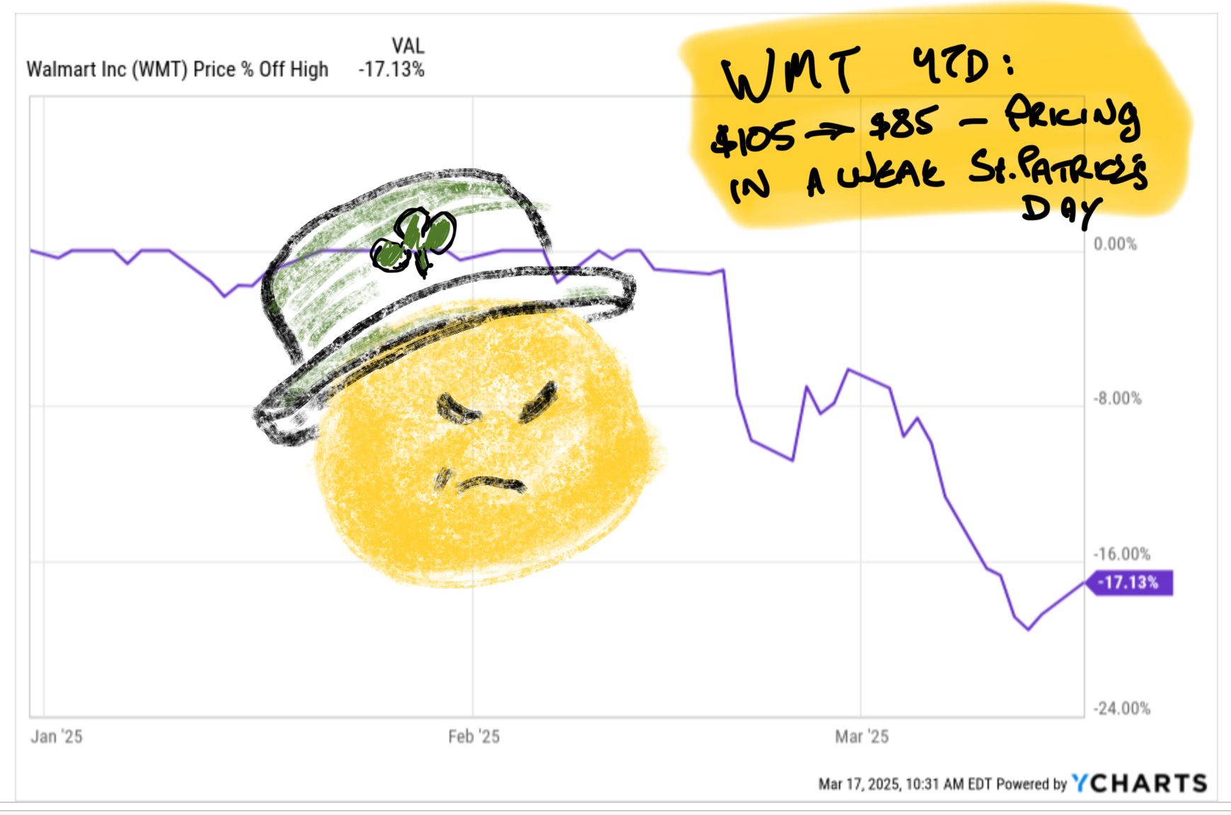 Shares of Walmart are down 17% in the month since the company took down guidance for the year based on Tariffs and the general ennui of consumers in the face of "economic uncertainty". Walmart wasn't a cheap stock at $105 but at $80 shares are pricing in a weak St Patrick's Day, a soft Easter and about a 70% chance of a lousy Christmas.
