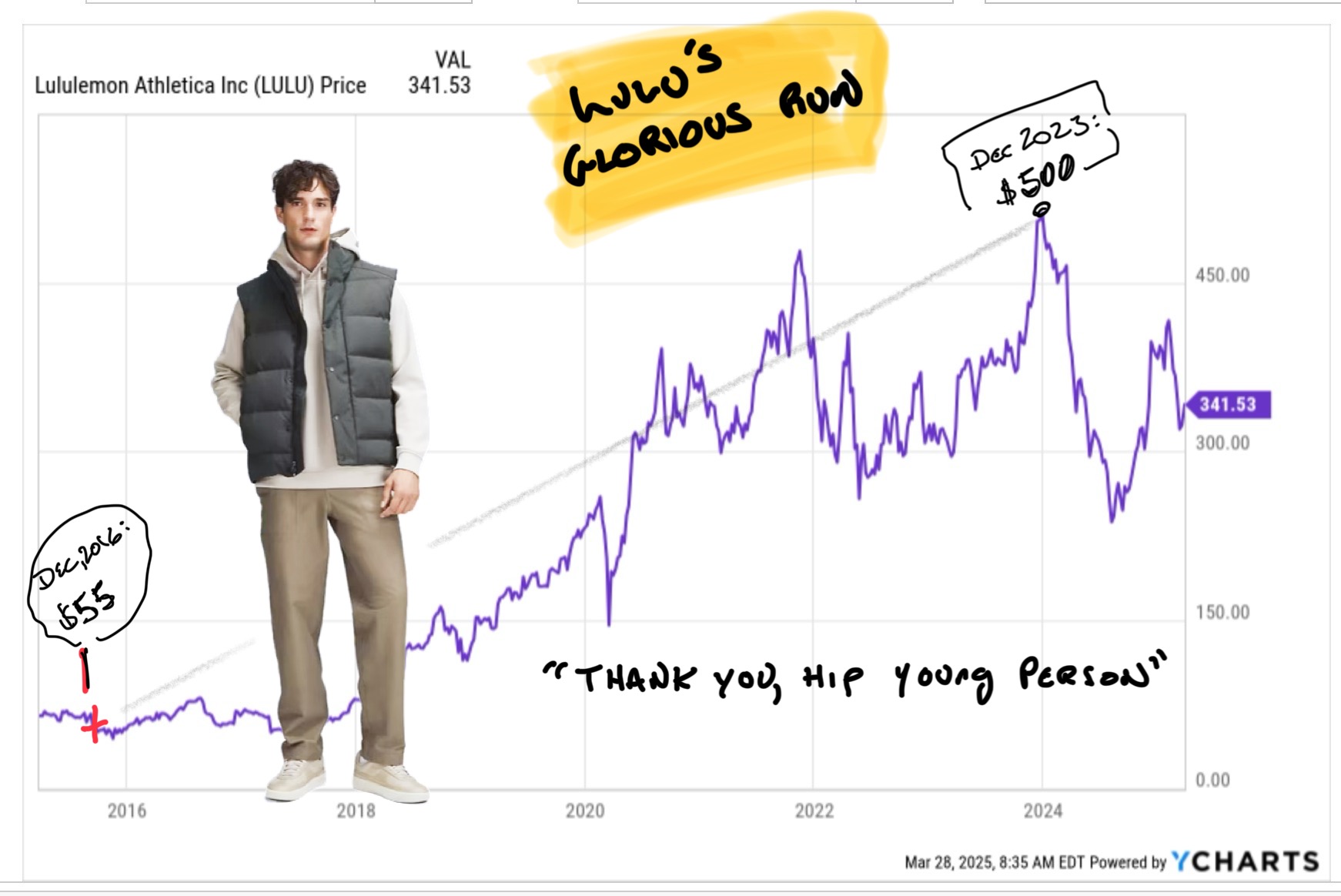 Lulu was $55 in 2016 and hit $500 in late 2013. The company created the modern retail model where e-commerce is a core element of the business, right from the start. While Gap was trying to strap e-commerce to the back of an overgrown store base Lululemon from tracking inventory with chips, making the app an indispensable and seamless part of the shopping experience. It's been a GD glorious run and I thank every vest-wearing Millennian banker in Anti-Ball-Crushing pants: